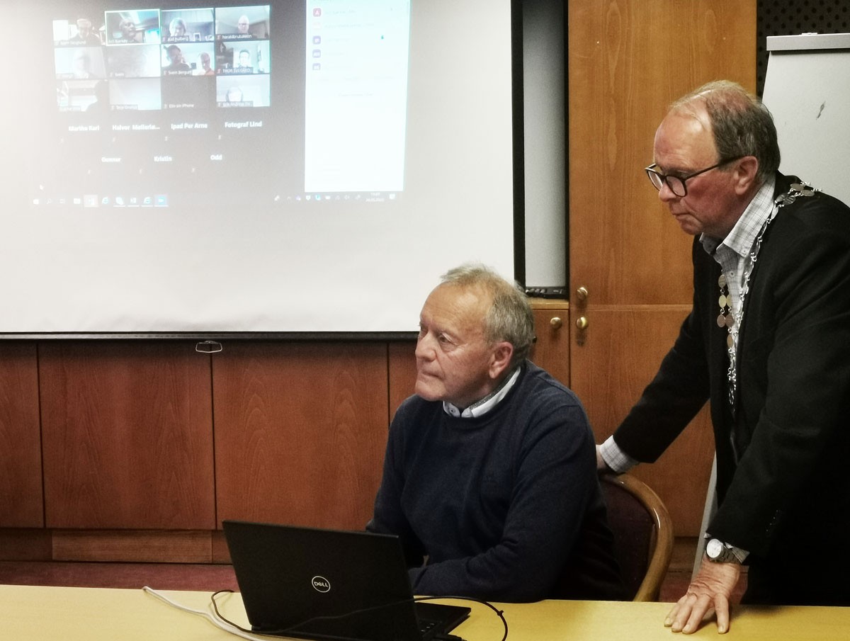 dager, tirsdag 9. juni. Her ser vi foredragsholderen Arne Svilosen ved PC i møterommet på Breiseth der president Halvor Møllerløkken overvåker teknikken i bakgrunnen. Medlemmene som fulgte møtet fra sin PC hjemmefra ble vist på lerretet i møterommet.