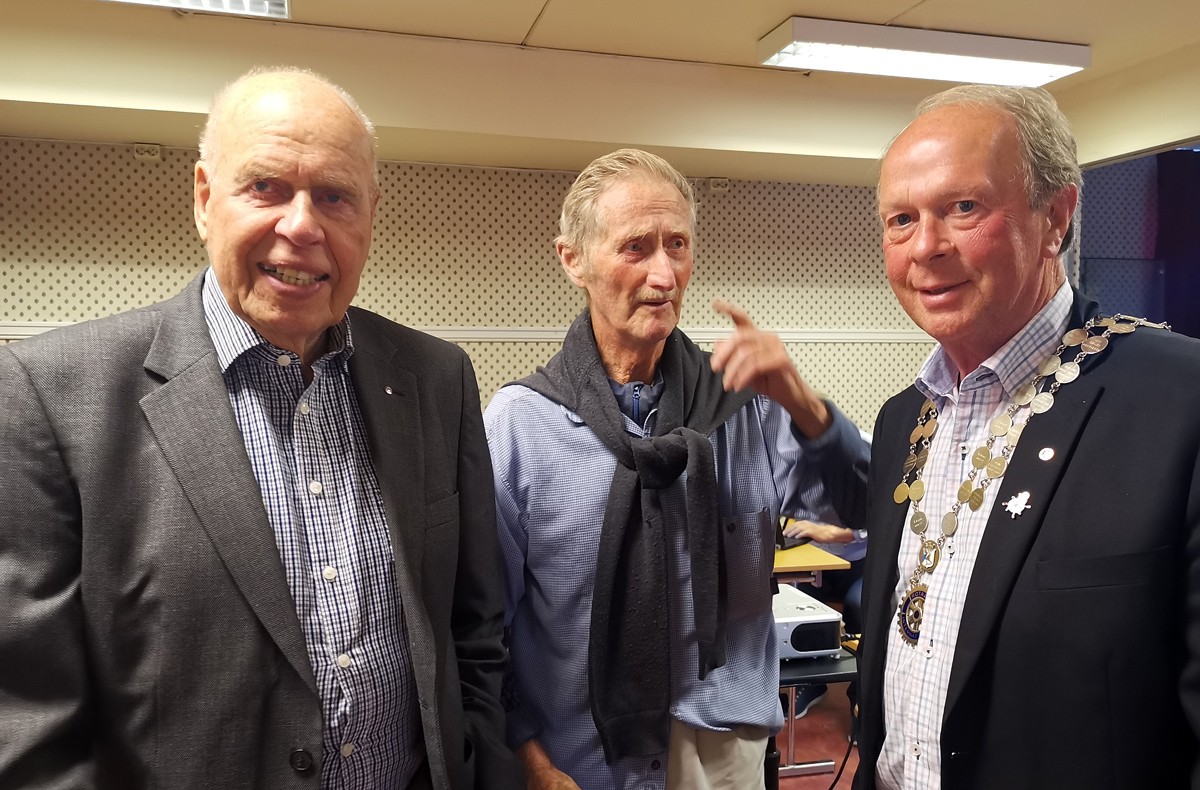 Seniorene i Rotaryklubben Ole Rønning tv. og Trygve Fure fulgte møtet fra møterommet. Her i samtale med president Halvor Møllerløkken etter møtet.