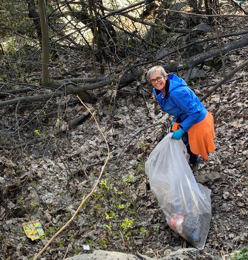 Ragnhild Falkenberg i arbeid med å plukke søppel lang Mesnaelva.