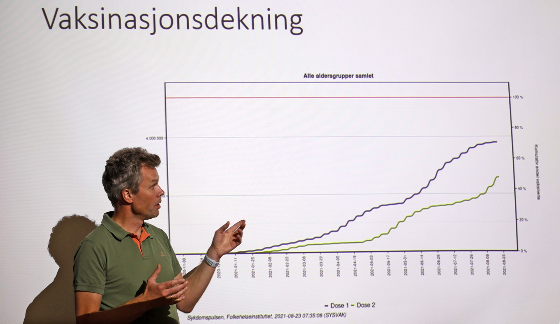 Pr. 15 september vil alle innbyggere i kommunen over 18 år være fullvaksinert med to doser. Vaksinering av 16 og 17-åringer starter nå. Det er ikke tatt stilling til en eventuell dose tre av vaksinen. Bergkåsa viste bl.a grafer som viste sammenhenger mellom antall smittetilfeller og antall sykehusinnleggelser. I disse tider ser vi at antall smittetilfeller øker kraftig, men antall sykehusinnleggelser er lavt. Vaksinen virker.