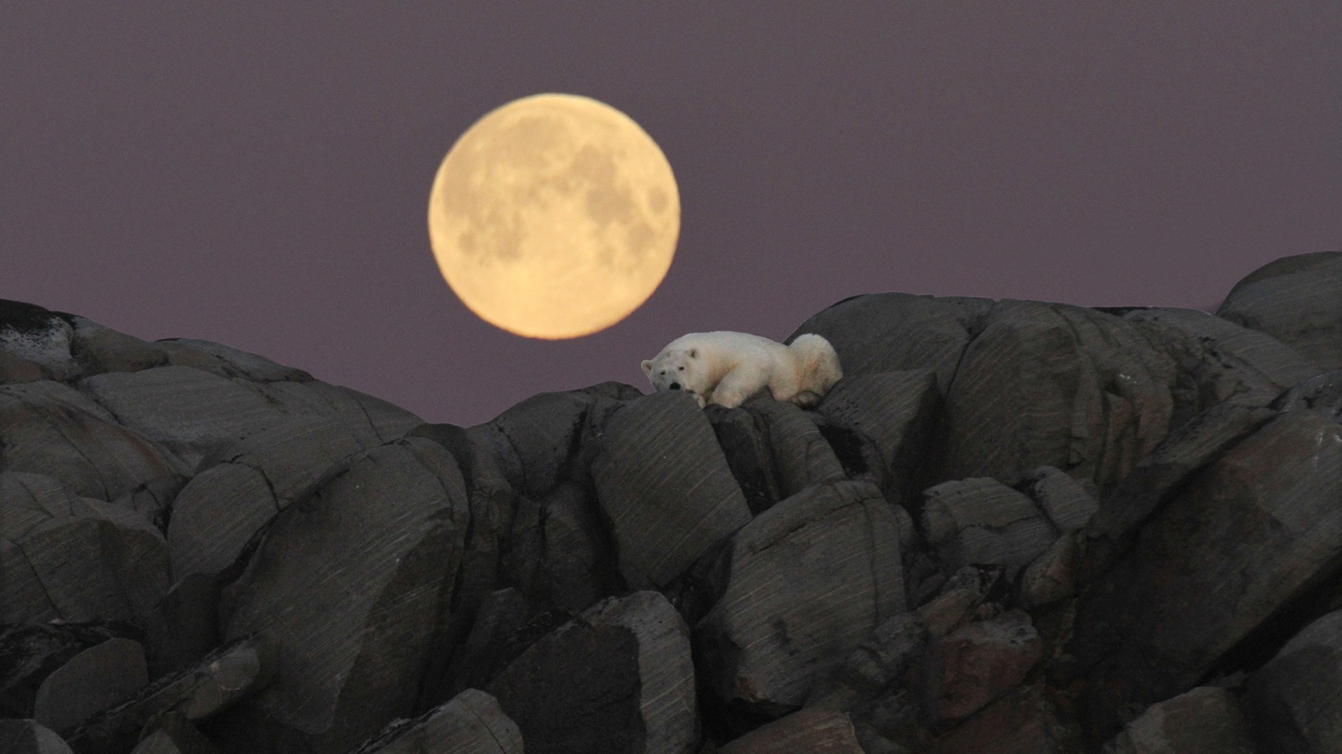 Ett av bildene fra hans fototur til Svalbard i september 2013, der han fikk fotografert en sovende isbjørn under fullmånen opp i fjellet på Sjuøyene, Norges nordligste øygruppe.