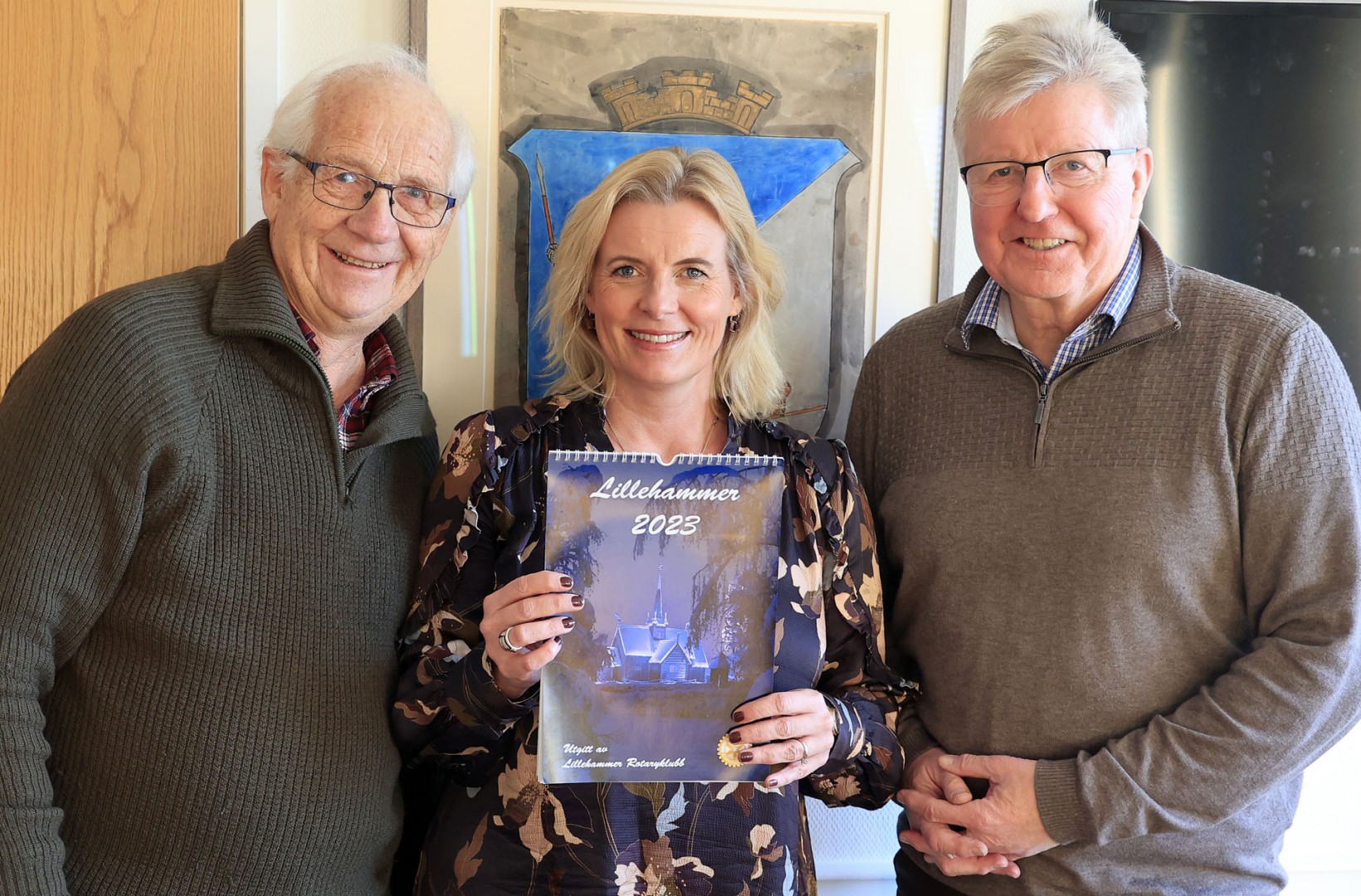Ordfører Ingunn Trosholmen fikk overrakt Lillehammerkalenderen 2023 fra Rotaryklubben.