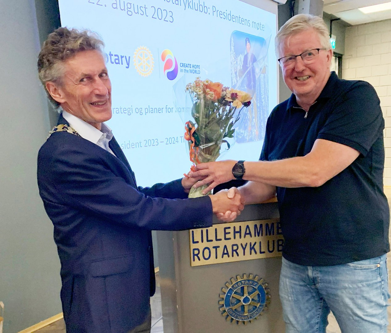 Presidenten gav oss en ryddig og strukturert presentasjon av de viktigste og overordna føringene for dette Rotaryåret, herunder de viktigste satsningsområdene og våre mål og ambisjoner. Det ble gått nærmere inn på Årets tema, som er psykisk helse, de 7 fokusområdene, klubbens Strategi – og Handlingsplaner, mv. Når det gjelder våre ambisjoner og satsninger for 2023 /2024 ble det særskilt nevnt viktigheten av å holde på det gode klubbfellesskapet og det som fungerer godt. Ifølge Presidenten er vi en klubb som blomstrer, er oppstemt og har mye god energi, og dette ikke minst takket være fjorårets President Finn Olsen. Finn fikk overrakt en pen blomsterbukett som takk for sin flotte innsats som President for perioden 2022/2023, etterfulgt av stor applaus fra salen.