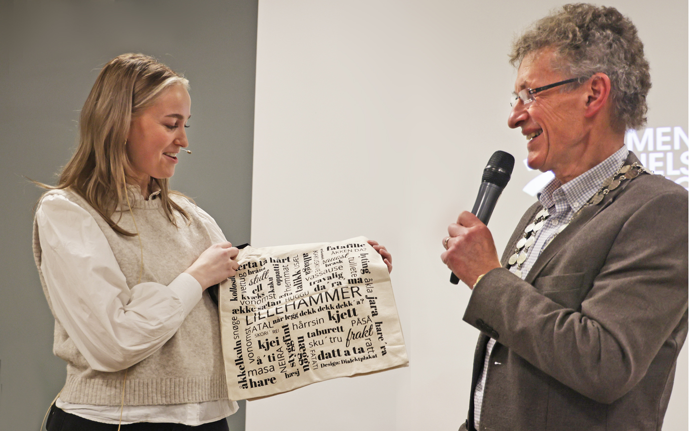 President Thor Svegården takket Katinka Zeiner for presentasjonen og overrakte et Bokhari bærenett med dialektord fra Lillehammer, som en liten gave.