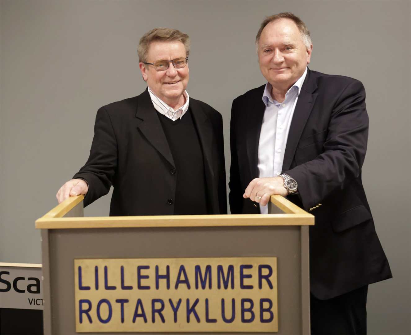 Klubbens eget medlem Ole Gunnar Austvik (til venstre) var faglig ansvarlig for møtet. Han kjenner Sverre Diesen fra ulike møter og konferanser og hadde invitert Diesen til dette Rotarymøtet om det høyaktuelle temaet; Ukrainakrigen.