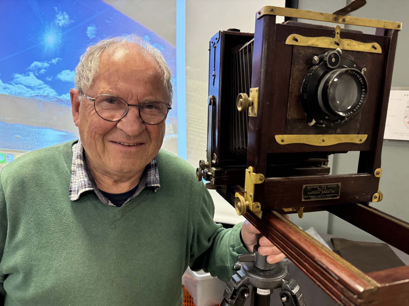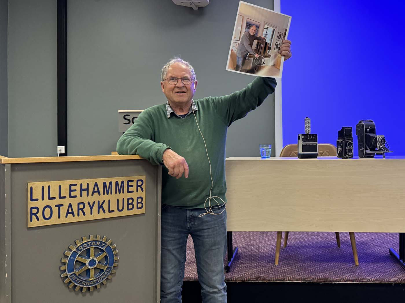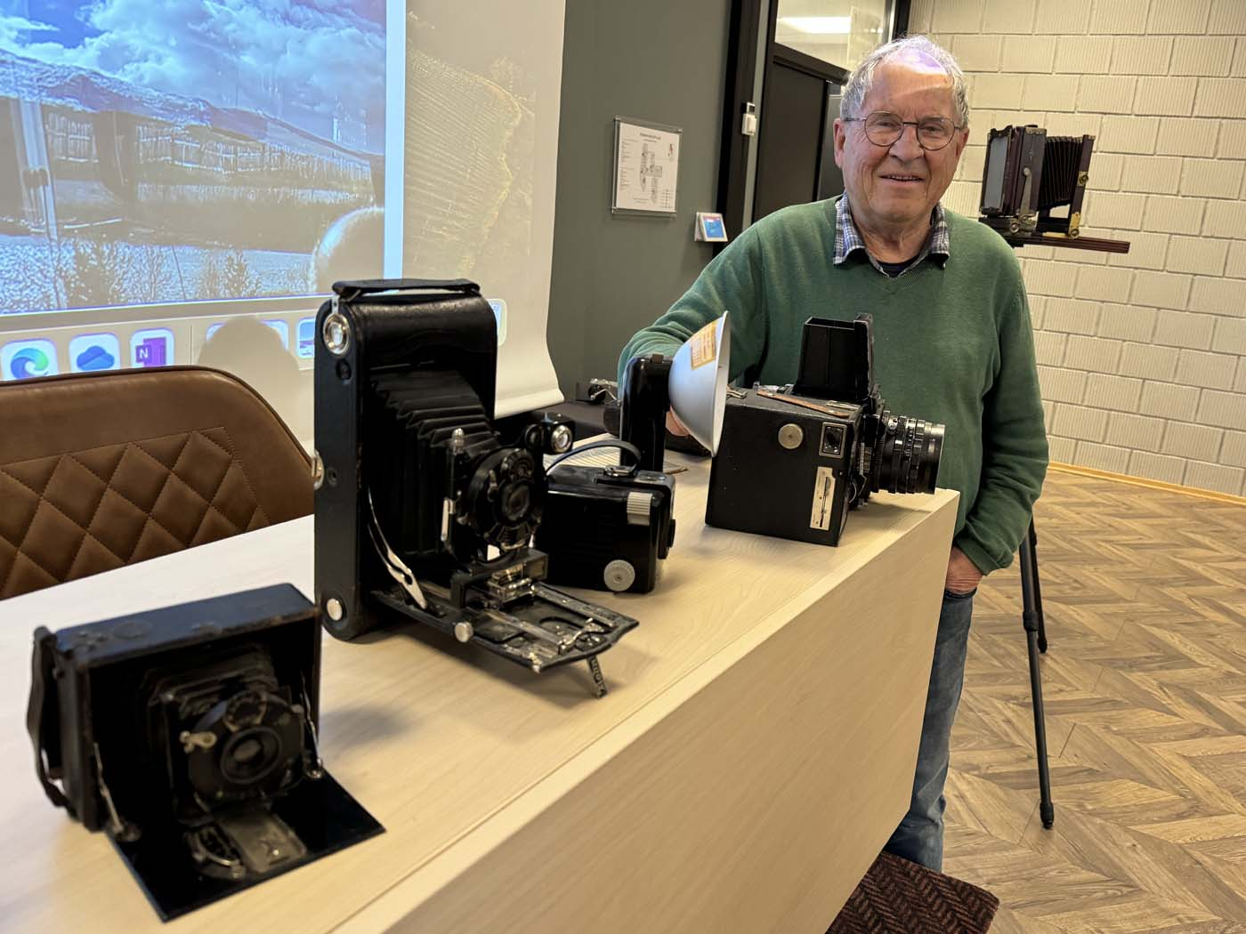 Under foredraget tok han oss med på en reise innenfor sitt fagområde; fotografi. Foran i møtelokalet, og spredt omkring på bordene i salen, var fotoapparater fra ulike perioder i historien plassert. For flere av oss var det et gjensyn som satte minnene i sving. Øistein har holdt på å fotografere helt siden glassplatefilmer var vanlig. Vi fikk også se eksempler på slike glassplater, og han forklarte via det medbrakte kameraet hvordan disse ble anvendt.
