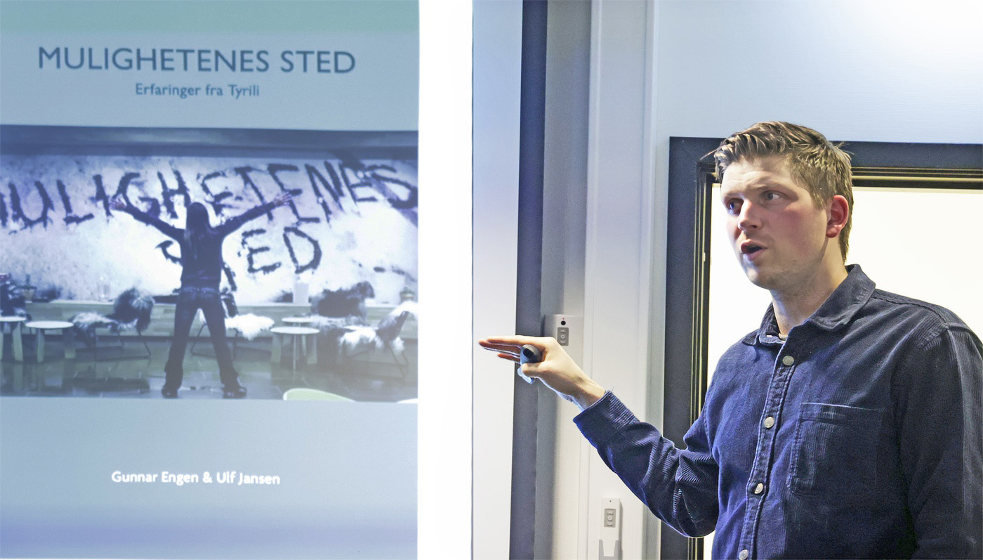 Her ble vi tatt imot av organisasjonspsykologisk rådgiver Jens Klev og regionleder for Tyrilistiftelsen Anita Holmestad som ga oss en fyldig orientering om stiftelsens historikk, utvikling og status.