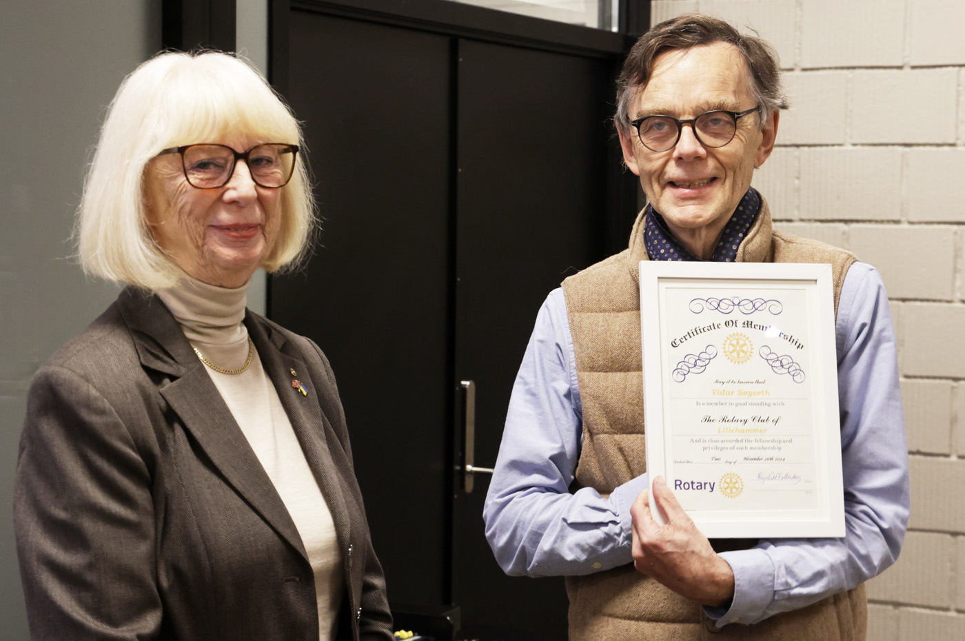 Da holder han sitt Ego-foredrag. Vidar ble tatt opp som medlem i klubben 26. november 2024 med vårt meget erfarne Rotarymedlem Margit Bjugstad som fadder.