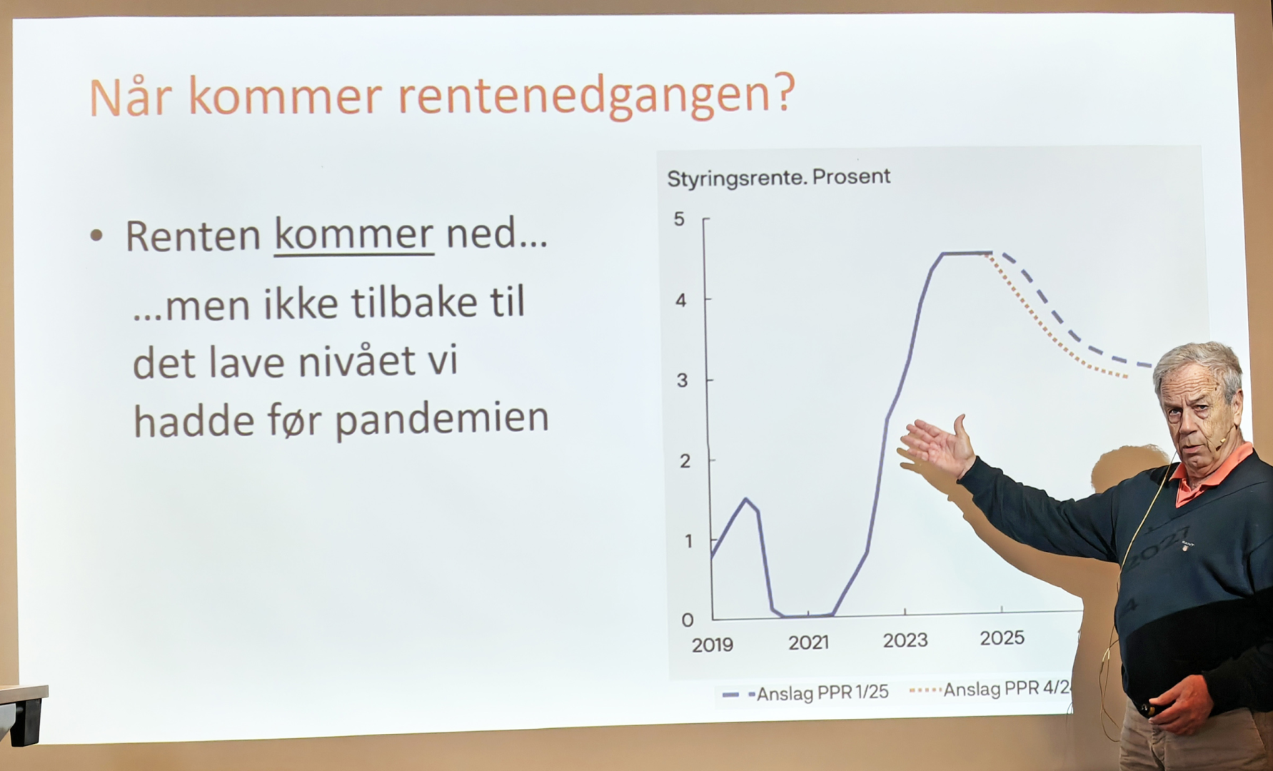 Han innledet med det han kalte «det lille spørsmålet», knyttet til utviklingen av styringsrenten. Styringsrenten rundt 2020-21 (under pandemien) var mellom 1 og 0 prosent. I dag er den på 4-tallet, og Olsen diskuterte hvor langt ned renta bør, noe han anslå til rundt 3%. Han ga også gode eksempler på både fordeler og ulemper med ulike rentenivåer. Olsen diskuterte videre hvor mye skade Trump kan påføre samfunnet gjennom handelskrig og rasering av offentlige institusjoner, noe som skaper stor usikkerhet.