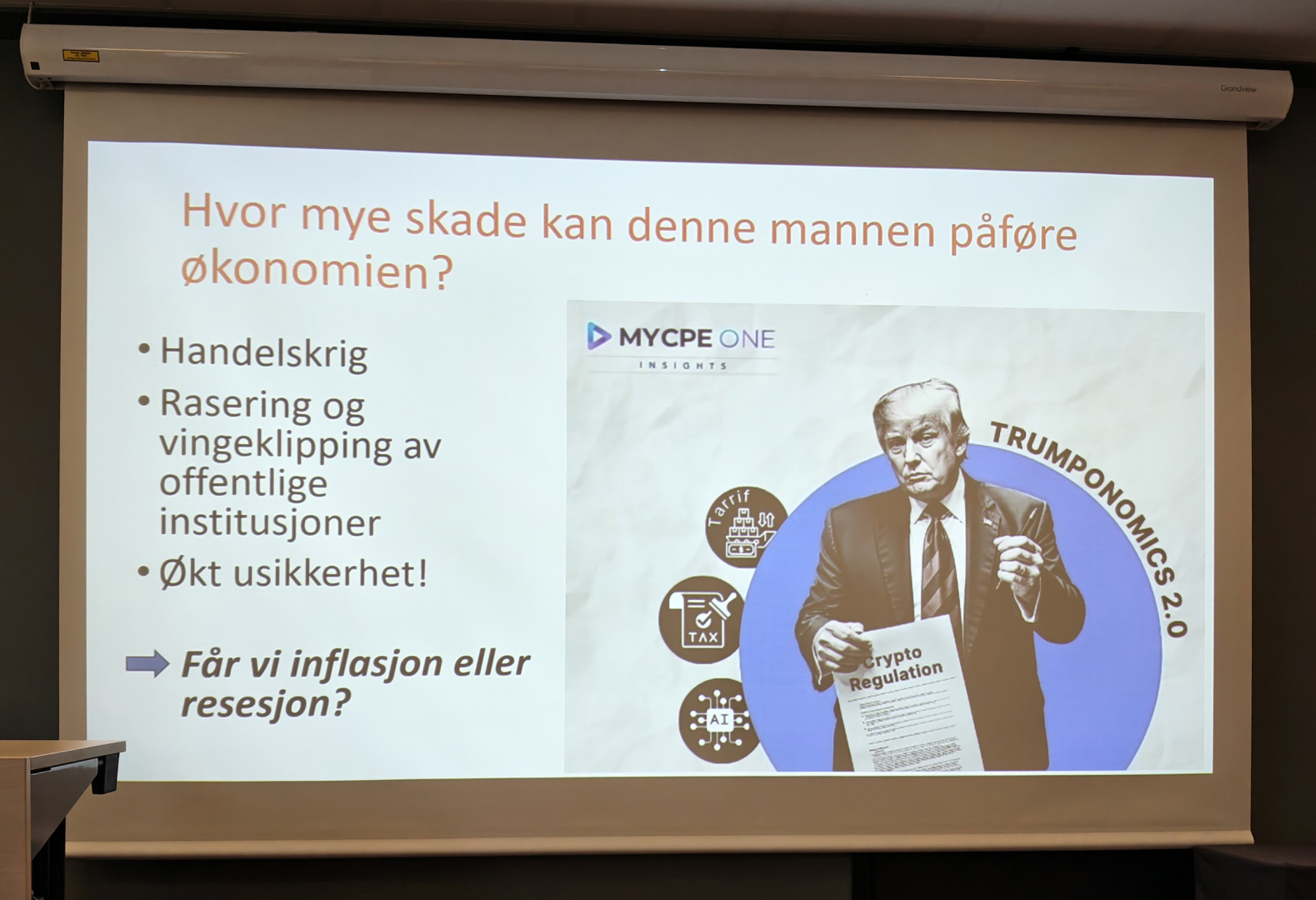 Og det første store spørsmålet han stilte var at stor usikkerhet pga. «en mafiaboss sin inntreden i det hvite hus» kan føre til merkantilisme. Dette betyr tilbakevending med proteksjonisme, og der gunstige handelsvilkår gis i bytte mot sikkerhetsgarantier. De økte tollsatsene rammer også amerikanske borgere, og kan faktisk paradoksalt nok heller bidra til å gjøre «America small again». Han diskuterte videre om den sterke dollaren var såkalt «rotårsak» til problemene og viste tall om den store statsgjelden i USA.