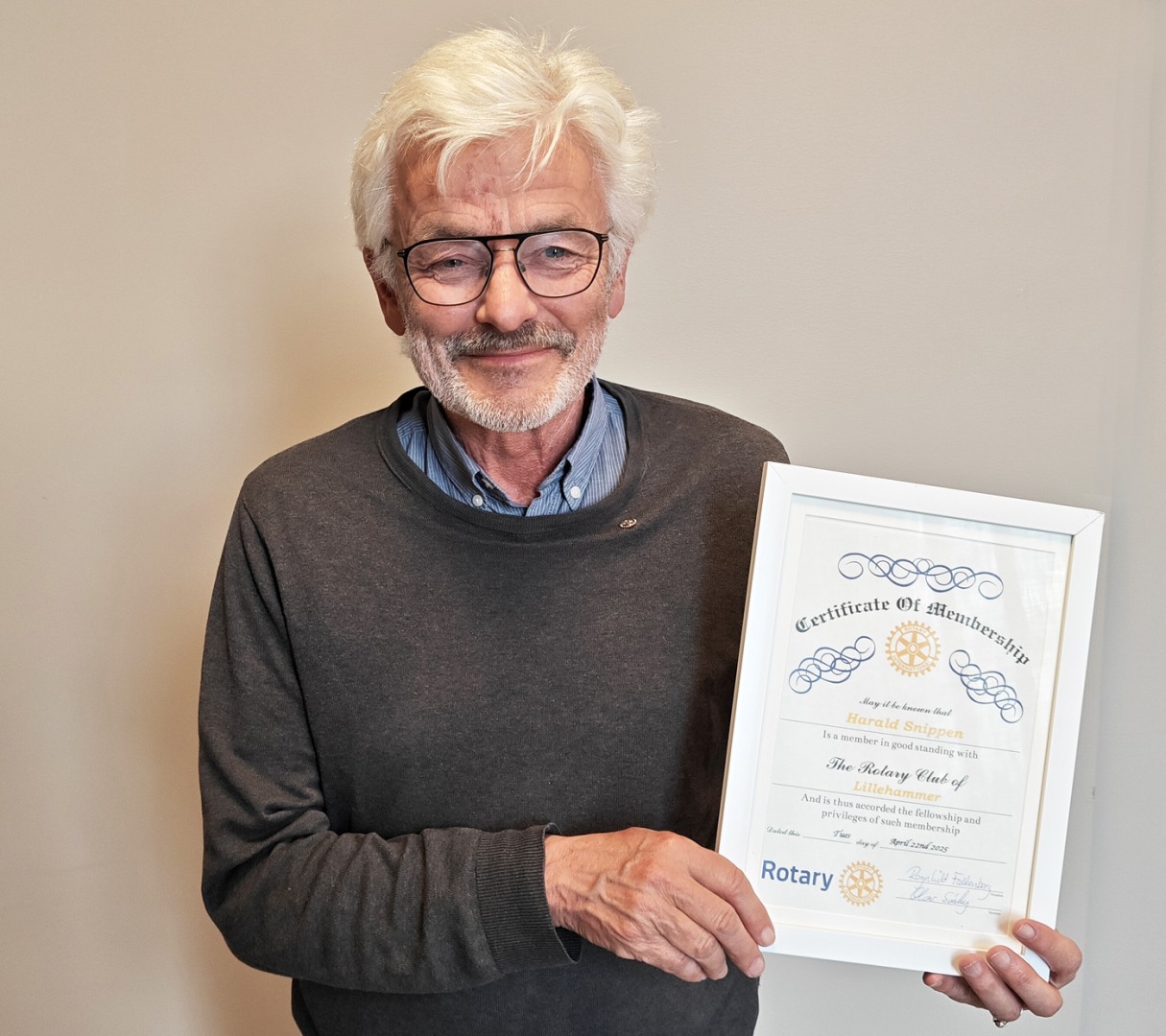 Under Rotarymøtet tirsdag kveld kunne president Ragnhild Falkenberg ønske Harald Snippen velkommen som nytt medlem i Lillehammer Rotaryklubb. Hun overrakte både Rotary nål og et innrammet Rotarysertifikat.  Klubben har med dette 57 medlemmer.