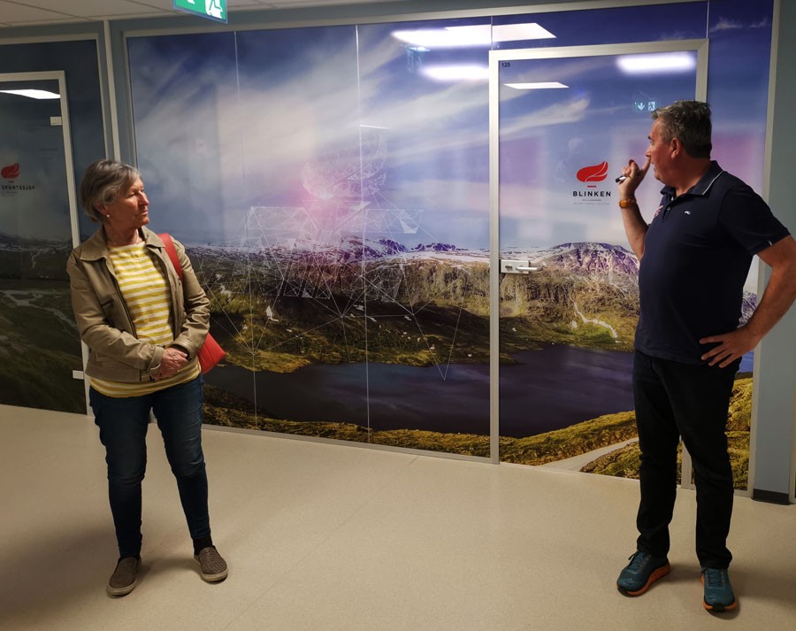 Flotte lokaler med vegger av glass, dekorert med store bilder og idrettspiktogrammer fra ulike idretter. Her er Anne Henriksen i samtale med Trond Hårberg ved en av disse flotte og delikate veggene.