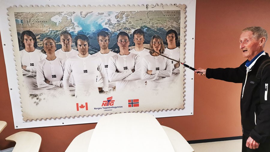 Møte mellom stryninger. 87 år gamle Trygve Fure fra Stryn måtte peke ut en kjent stryning på ett av veggbildene ved NTG. Johannes Tingnes Bø fra Stryn har vært elev ved skolen.