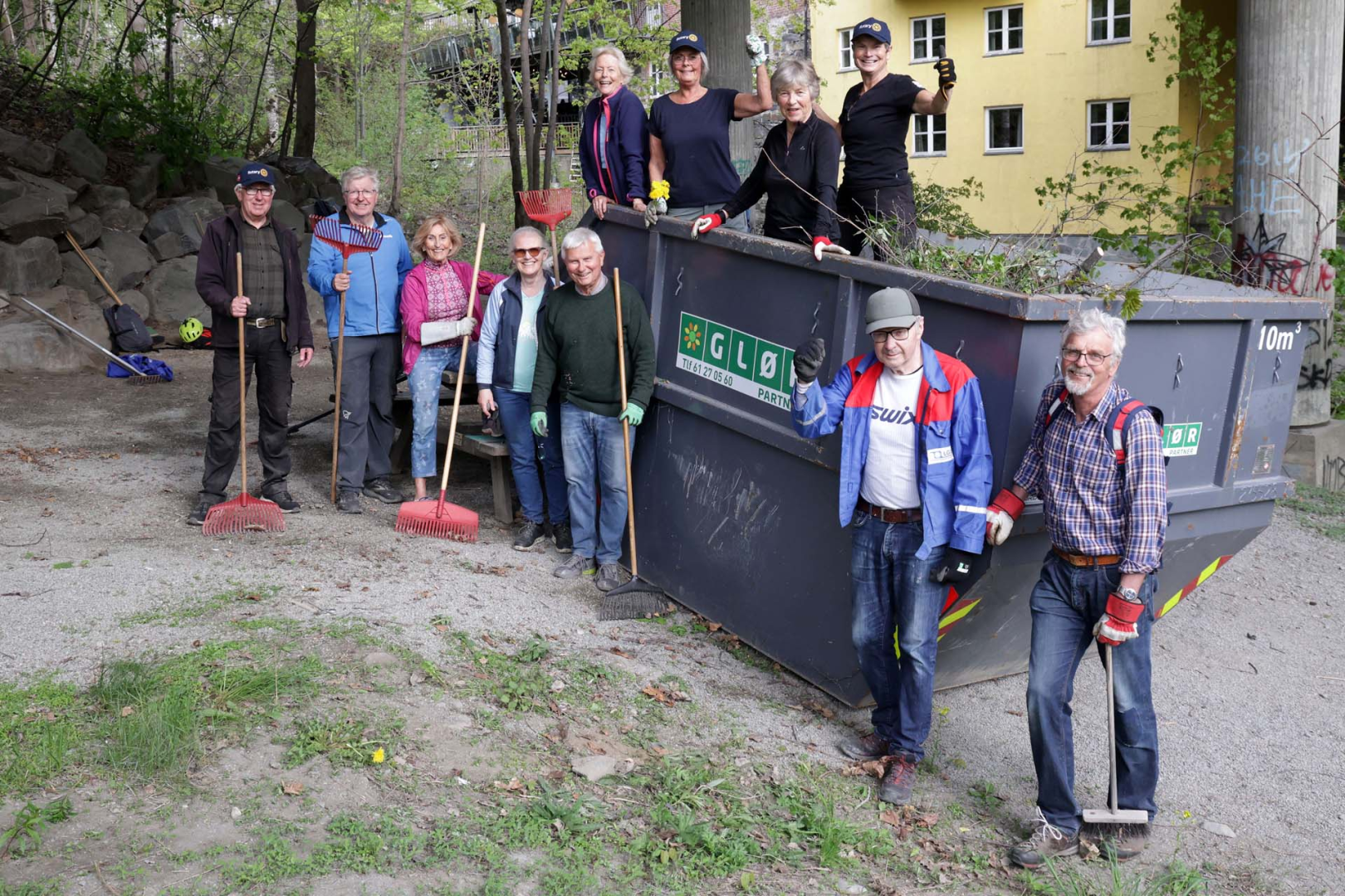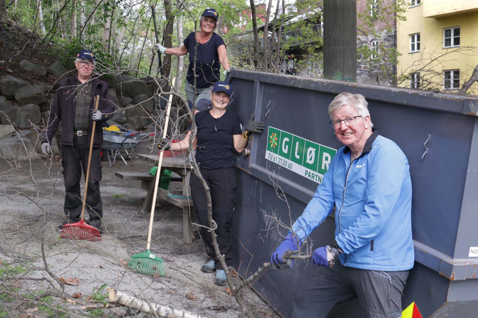 Her er vel halvparten i de de som deltok i årets vårdugnad samlet ved containeren som GLØR hadde utplassert. Foran fra venstre Olav Sørby, Finn Olsen, Anne Lise Gjestvang, Ingjerd Lien Kvelstad, Einar Fæste, Stein Ivar Lien og Kjell Roar Rognstad. De som tråkker lasset i containeren fra venstre Solveig Josten, Ragnhild Falkenberg, Kristin Rustad og Marit Elvsås.