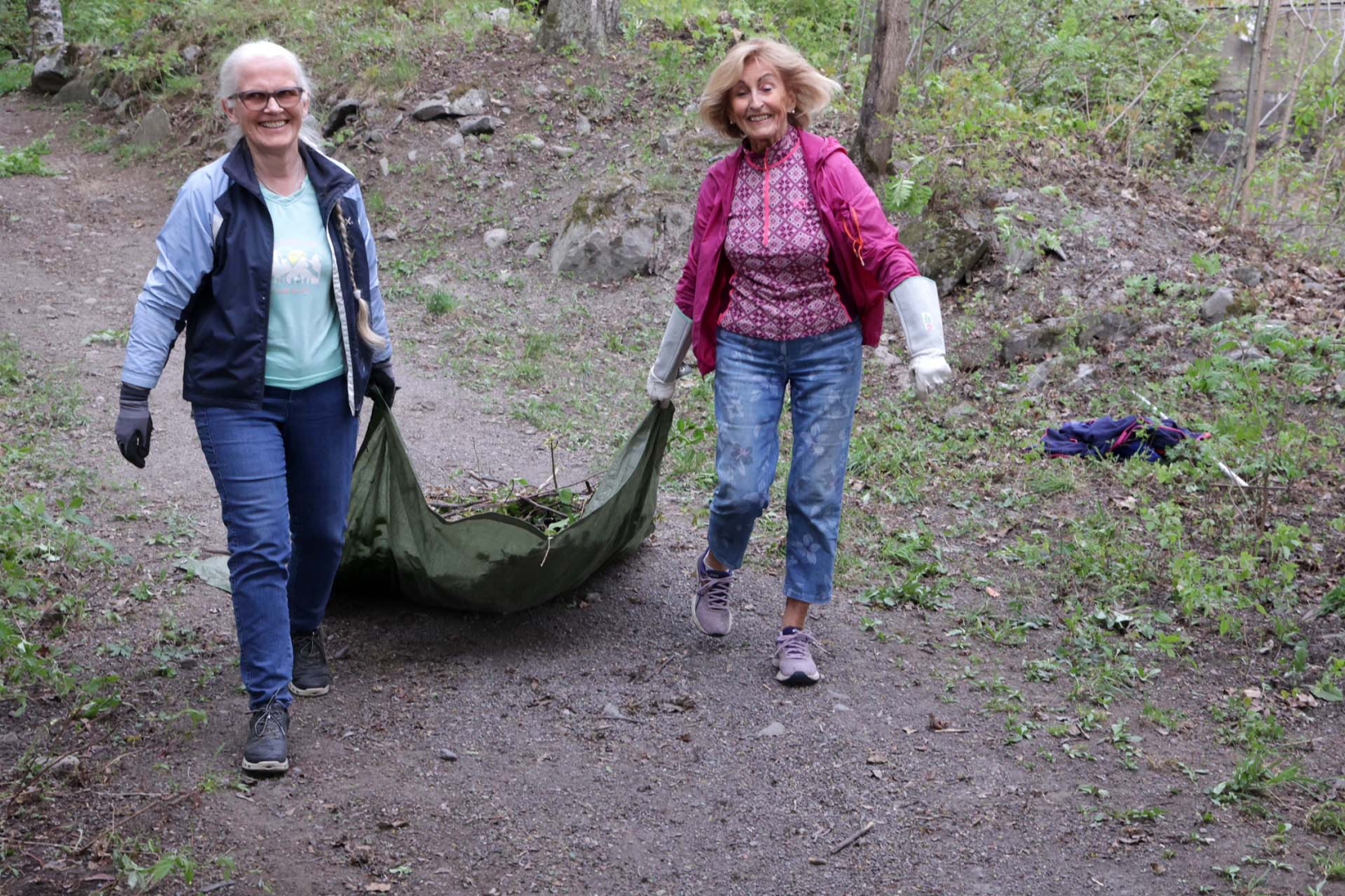 Ingjerd Lien Kvelstad og Anne Lise Gjestvang fraktet store mengder løv ned til containeren.
