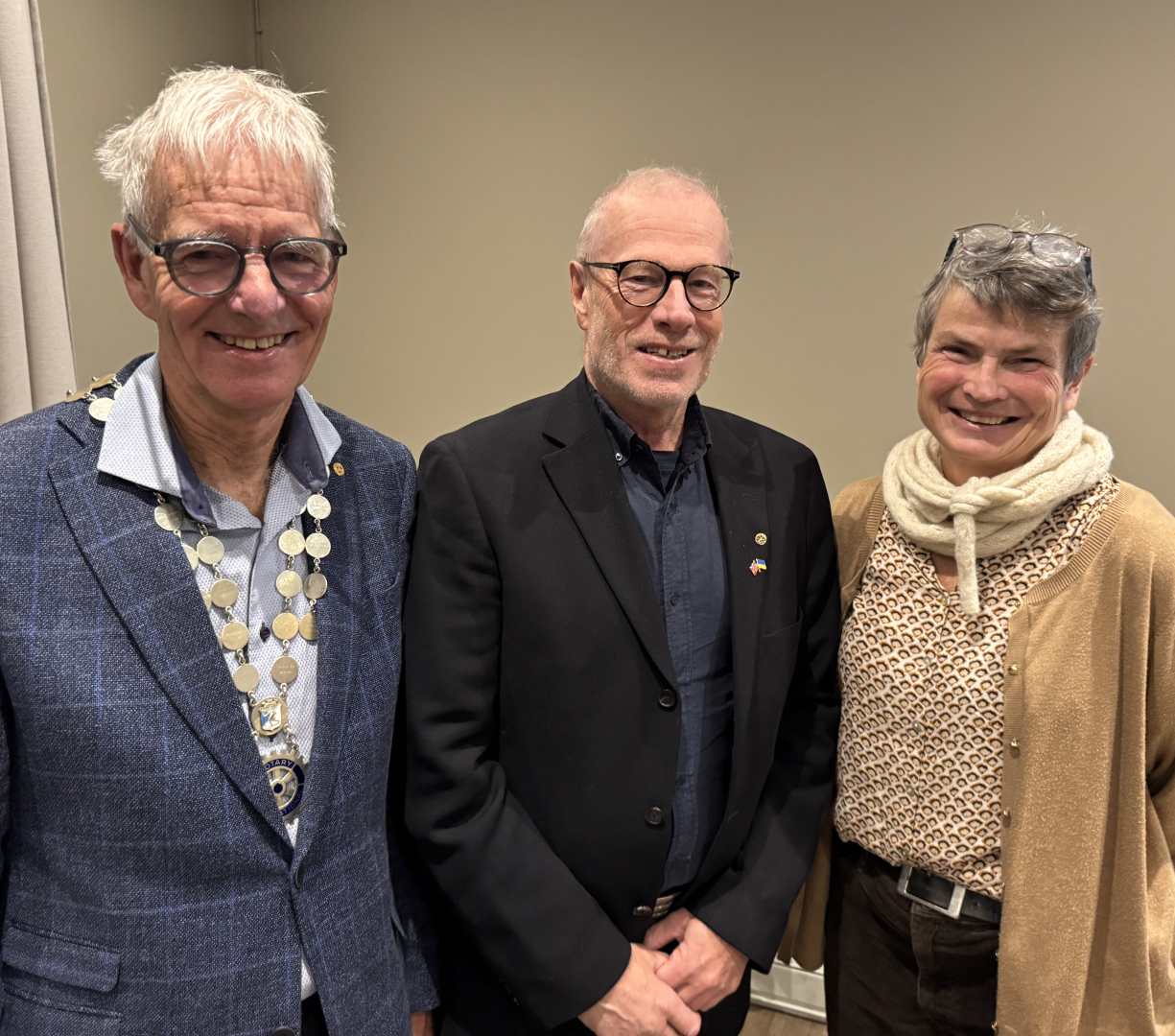 Marti Elvsås ble klappet inn og valgt til president for Rotaryåret 2027-28. Her er hun sammen med årets president Jan Erik Svendsen, neste års president Lars Hanstad (2026-27).