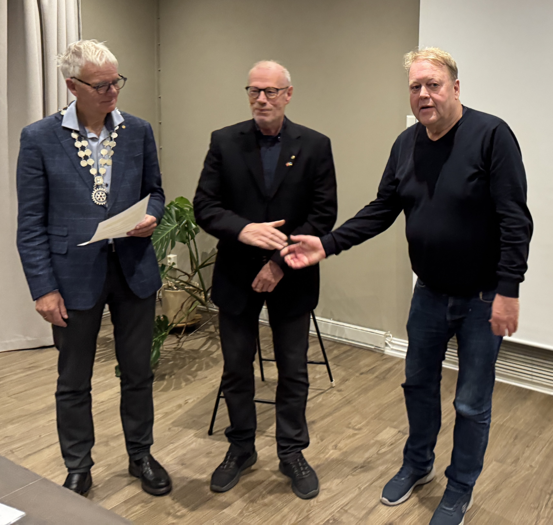 Kjell Stenberg ble tatt opp som nytt medlem i klubben som nå har 56 medlemmer. Han har tidligere være Rotary-medlem og lovte at han skulle bli et aktivt og taleført medlem i klubben. Her er han sammen med presidenten Jan Erik Svendsrud og Lars Hanstad som er Stenbergs fadder.