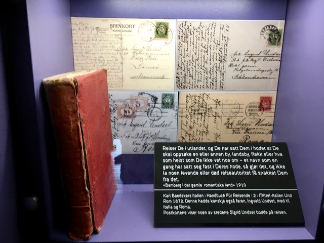 Deretter orienterte Bente Fossberg om utstillingen som nå er på Bjerkebæk. Sigrid Undset gjør om et uthus til gjestehus som ble utvidet en del. Hun hadde ofte gjester på besøk. Her er en utstilling om hennes reiser rundt om i verden. Det er et utvalg fordi Sigrid Undset reiste mye. I utstillingen har de brukt hennes ord og utsagn.