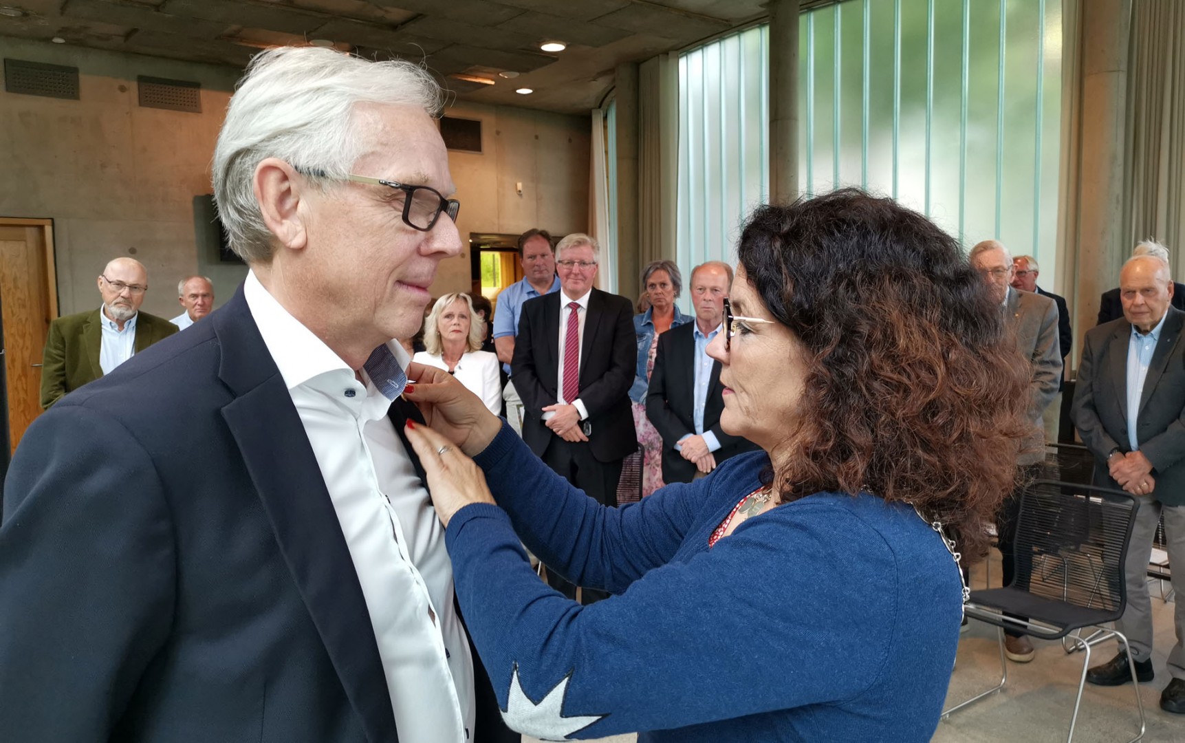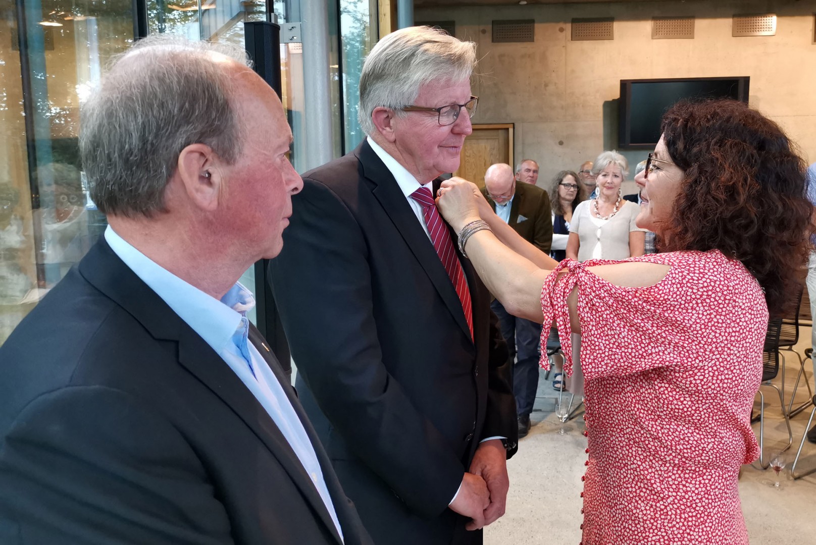 Finn Olsen ble tatt opp som nytt medlem i Lillehammer Rotary. Her fester president Elin Lyftingsmå Rotarynålen på jakkeslaget til Finn. Fadder Halvor Møllerløkken bivåner det hele. Velkommen som nytt medlem, Finn!