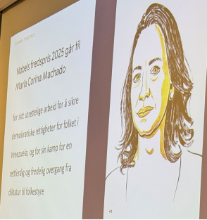 Bildet: Nobel Fredspris 2025 gikk til Maria Courina Machado for sitt utrettelige arbeid for å sikre demokratiske rettigheter for folket i Venezuela, og for sin kamp for en rettferdig og fredelig overgang fra diktatur til folkestyre.